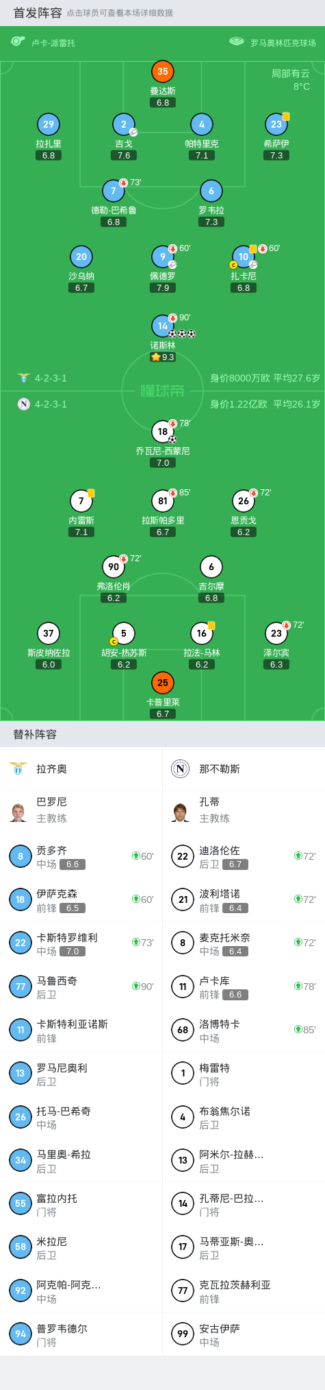 意大利杯1/8决赛:拉齐奥3-1胜那不勒斯,诺斯林帽子戏法